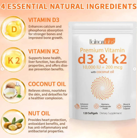 Vitamin D3 + K2 with Coconut Oil – 2-in-1 Support for Bones, Joints & Immunity